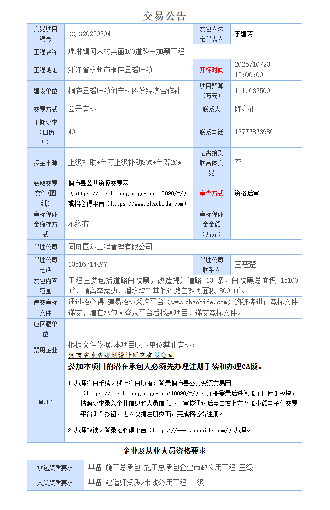 瑶琳镇何宋村美丽100道路白加黑工程公开招标公告