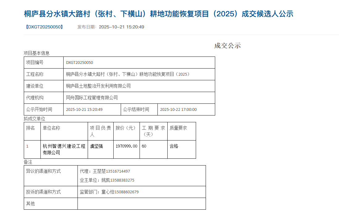 桐庐县分水镇大路村(张村、下横山)耕地功能恢复项目(2025)中标公示